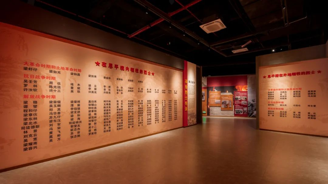 紅色恩平展廳以紅色、熟褐色為主色調,象征革命的發展和成就。以恩平人民在黨的領導下,進行頑強革命斗爭為主線索,將本展廳分為序廳、第一部分:大革命時期、第二部分:土地革命時期、第三部分:全面抗日戰爭時期、第四部分:解放戰爭時期、第五部分:革命烈士名錄。