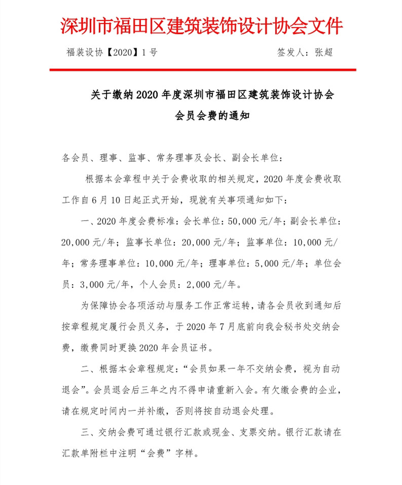 關于繳納2020年度深圳市福田區建筑裝飾設計協會會員會費的通知