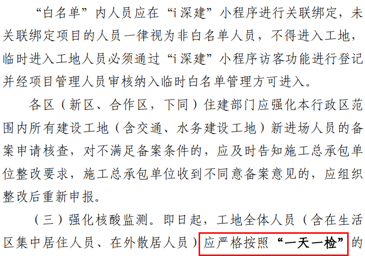 5、即日起,工地全體人員(含在生活區集中居住人員、在外散居人員應嚴格按照“一天一檢”的要求參加核酸檢測,確保“不漏一人”。
