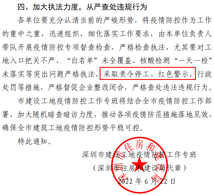 開展疫情防控專項督查檢查,嚴格檢查執法,尤其要對工地入口把關不嚴、“白名單”未全覆蓋、核酸檢測“一天一檢”未落實等突出問題嚴格執法,采取責令停工、紅色警示、行政處罰等措施,嚴格督促企業整改閉合,嚴格查處違法違規行為。
