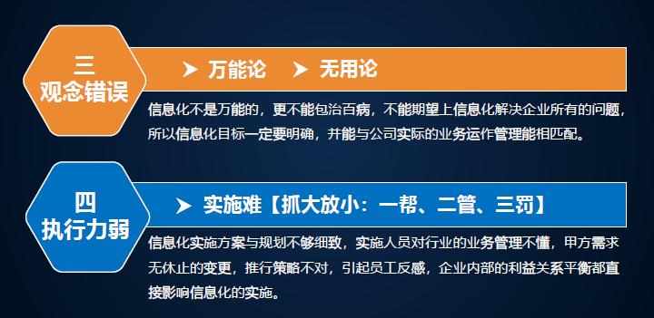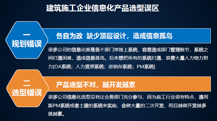 建筑施工企業(yè)信息化產(chǎn)品選型誤區(qū)。很多企業(yè)信息化又想做又害怕,我們總結(jié)了幾方面的問(wèn)題,規(guī)劃錯(cuò)誤,缺少頂層設(shè)計(jì)造成信息孤島。每一個(gè)部門(mén)買(mǎi)自己的。我們了解過(guò)一個(gè)企業(yè)有八套系統(tǒng),都是獨(dú)立的,最后作為領(lǐng)導(dǎo)什么數(shù)據(jù)看的都是不一樣的。產(chǎn)品先型不對(duì),越開(kāi)發(fā)越累,要懂行的才能研究出來(lái),如果找一個(gè)軟件,他什么都不懂,能給你研發(fā)出相關(guān)行業(yè)軟件嗎?不行,要選對(duì)。萬(wàn)能論、無(wú)用論,軟件不是萬(wàn)能的,也不是無(wú)用的,關(guān)鍵是怎么用。能實(shí)施好才是最主要的。對(duì)于信息化,不管花幾十萬(wàn)、幾百萬(wàn)、幾千萬(wàn),要落地,否則就打水漂了。信息化是請(qǐng)老師還是請(qǐng)學(xué)生?