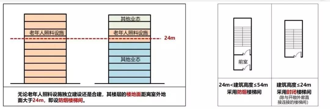 新規(guī)范 5.1.1:建筑高度大于24m的獨立建造的老年人照料設施為一類高層民用建筑。