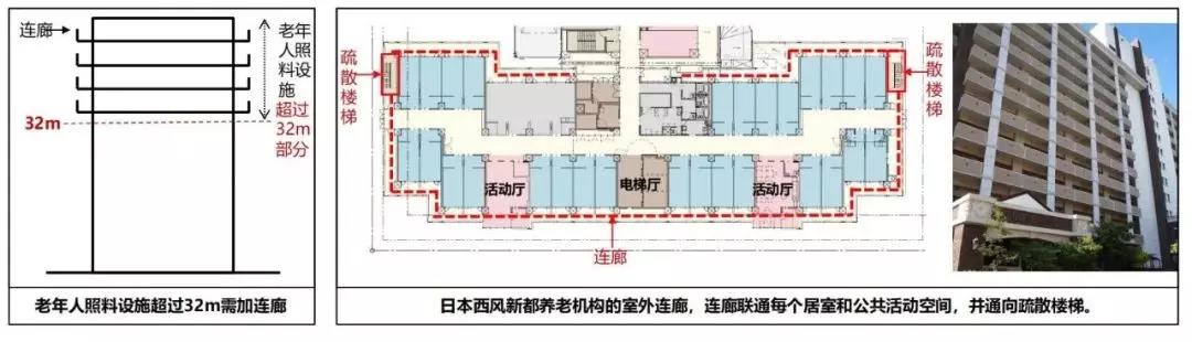 新規(guī)范 5.5.13A:建筑高度大于32m的老年人照料設施,宜在32m以上部分增設能連通老年人居室和公共活動場所的連廊,各層連廊應直接與疏散樓梯、安全出口或室外避難場地連通。